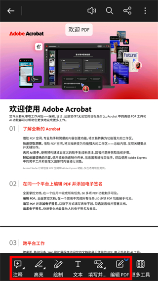 4、在文件閱讀界面,點(diǎn)擊下方工具欄,選擇注釋、高亮、編輯PDF等工具,即可使用對應(yīng)功能。