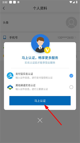 3、在彈出的認(rèn)證方式選擇框中,選擇支付寶實(shí)名認(rèn)證后,點(diǎn)擊馬上認(rèn)證按鈕。