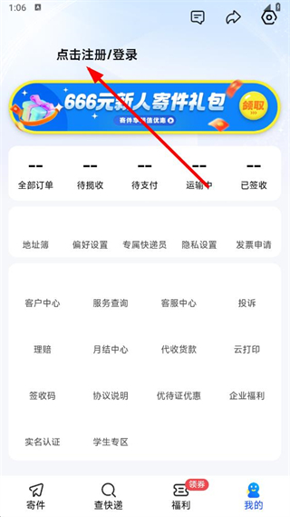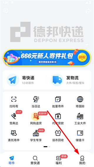 1、打開德邦快遞APP,在首頁點擊右下角我的選項。