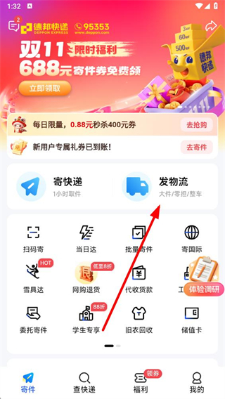 1、打開德邦快遞APP,在寄件頁面點擊發(fā)物流選項。