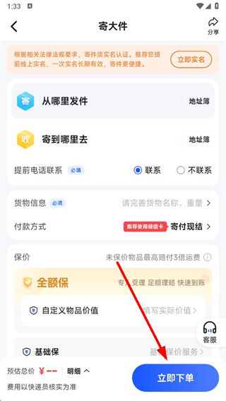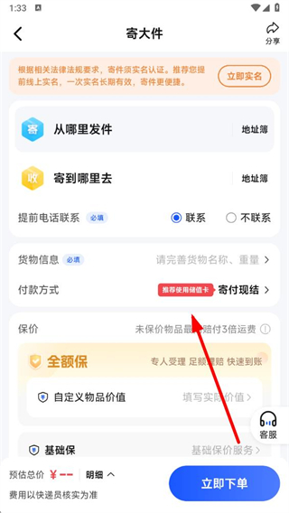 4、選擇付款方式和保價服務后,點擊立即下單即可完成大件寄件。