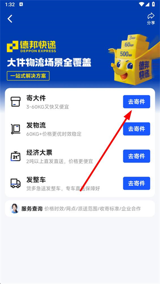2、在大件物流場景頁面中,點擊寄大件右側(cè)的去寄件按鈕。