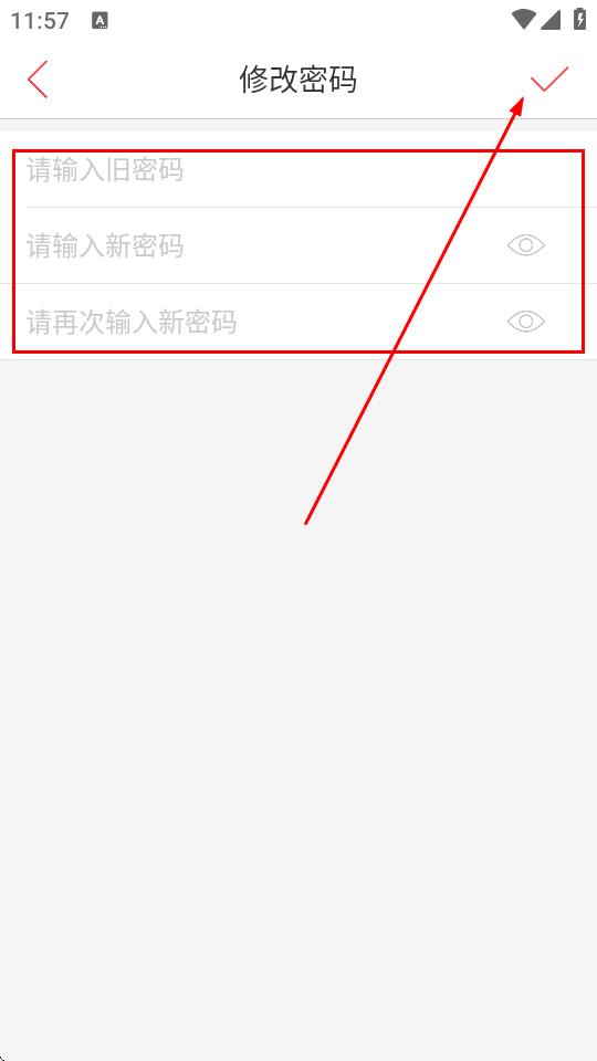 4、在修改密碼頁面,輸入舊密碼、新密碼,再次輸入新密碼進(jìn),點擊對勾圖標(biāo)即可。