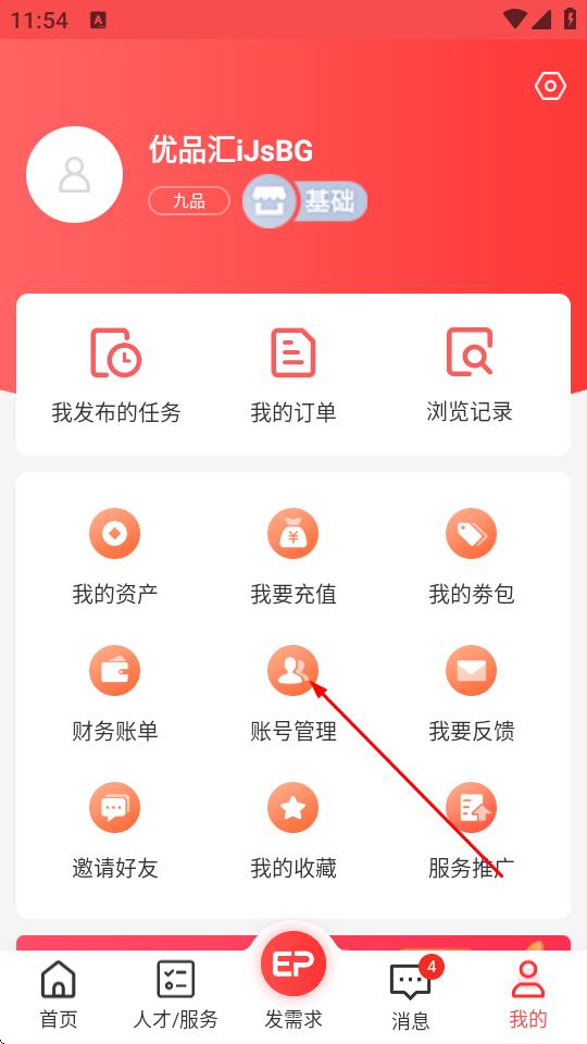 2、在我的頁面,點擊賬號管理選項。