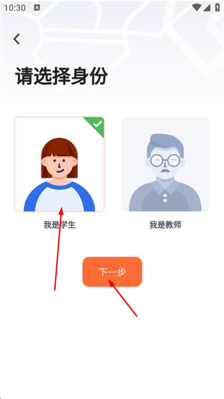 2、在身份選擇頁面選擇我是學(xué)生,點(diǎn)擊下一步。