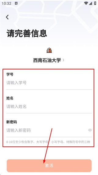 5、輸入學(xué)號(hào)、姓名,設(shè)置新密碼,點(diǎn)擊激活,即可完成賬號(hào)注冊(cè)操作。