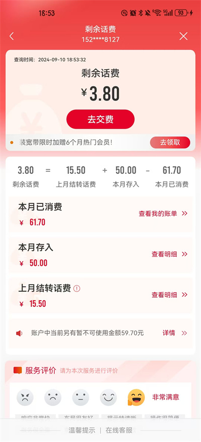 3、進(jìn)入后可以看到在剩余話(huà)費(fèi)那里查看到自己的話(huà)費(fèi)余額,并且還可以點(diǎn)擊進(jìn)入看詳細(xì)話(huà)費(fèi);