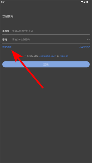 1、打開云柜快遞員APP,在登錄頁面點擊我要注冊,進入注冊界面。