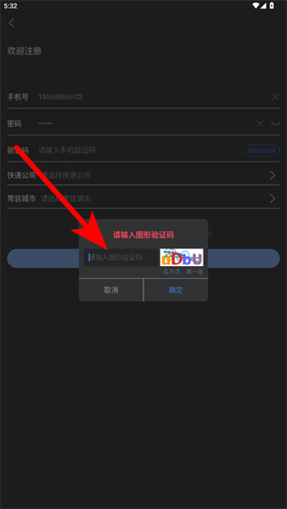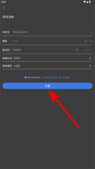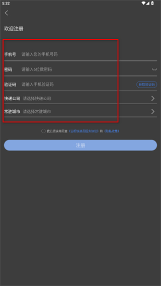 2、在注冊界面填寫手機號、密碼,獲取并輸入手機驗證碼,選擇快遞公司和常駐城市。
