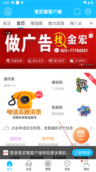 1、打開愛武隆客戶端,點擊頁面右下角“我的”選項,進(jìn)入個人中心頁面。