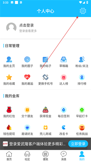 2、進(jìn)入個人中心后,點擊設(shè)置圖標(biāo),進(jìn)入設(shè)置頁面。
